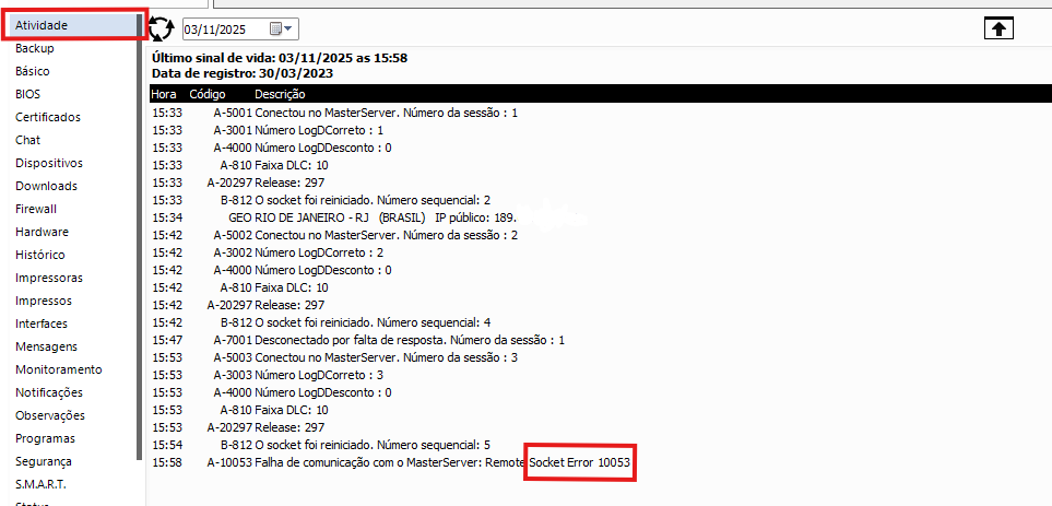 A seção “Atividade” na área de informações (Área 7) é uma ferramenta essencial para o diagnóstico e a resolução de problemas em dispositivos remotos, como, por exemplo, para investigar a causa de uma falha de backup. Essa funcionalidade oferece um registro detalhado das atividades e eventos de conexão do dispositivo. No entanto, é frequente que os usuários encontrem códigos e mensagens de “soquete” (socket) específicos que não possuem documentação ou explicação clara.