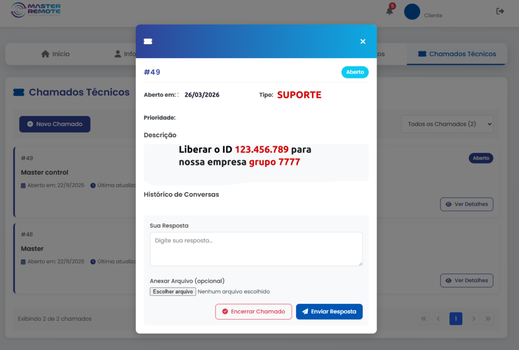 - Opção 2 – O responsável pela empresa que deseja a titularidade do ID deve acessar sua área de cliente e abrir um chamado técnico da opção “SUPORTE”. Nesse chamado, é necessário informar o(s) ID(s), solicitar a liberação da titularidade do uso do ID para sua empresa.