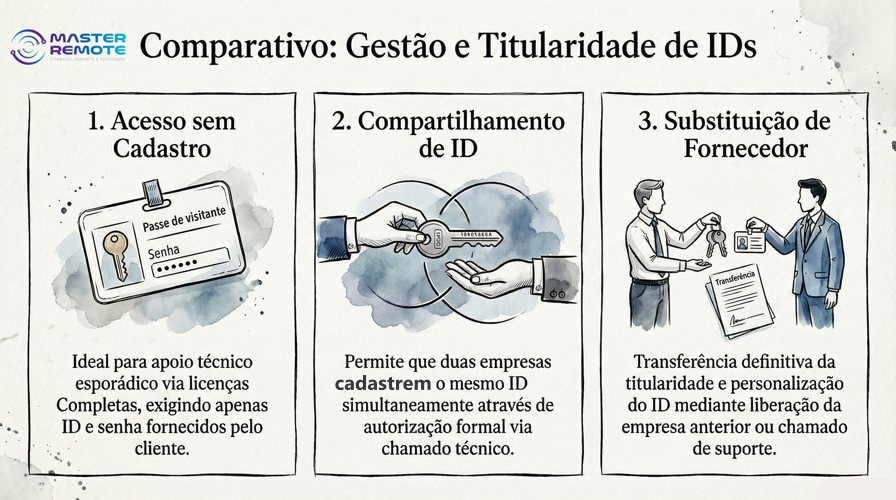 Nos softwares da Master Remote, o ID (identificador) é um código único e permanente que identifica de forma precisa cada dispositivo ou sessão dentro da plataforma de acesso remoto. Ele é fundamental para estabelecer uma conexão segura e com autenticação multifator entre o Master Control e o agente do dispositivo remoto.